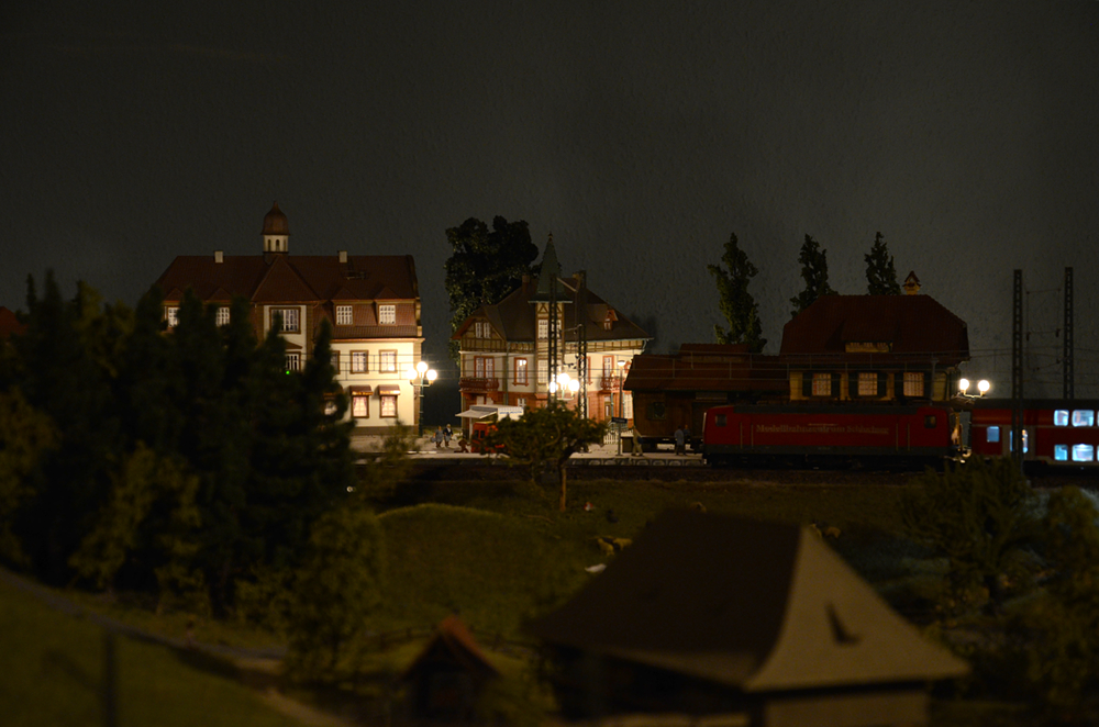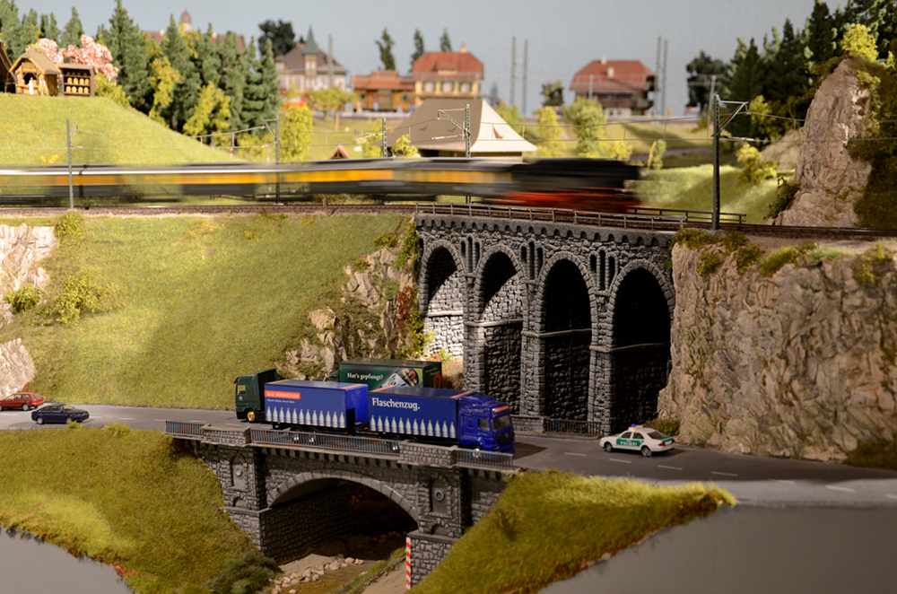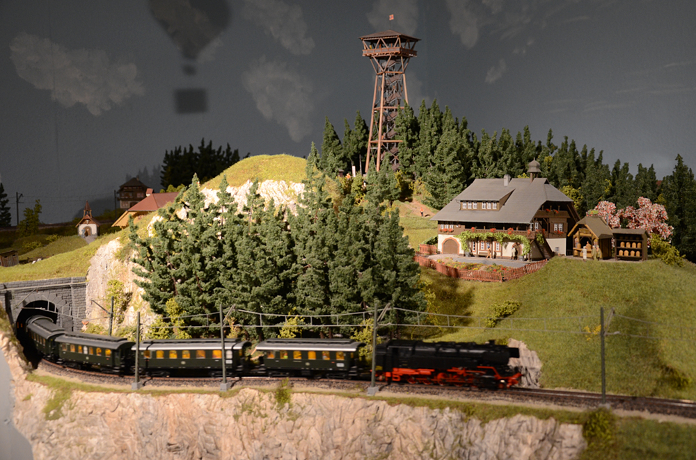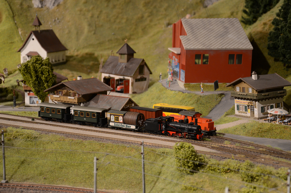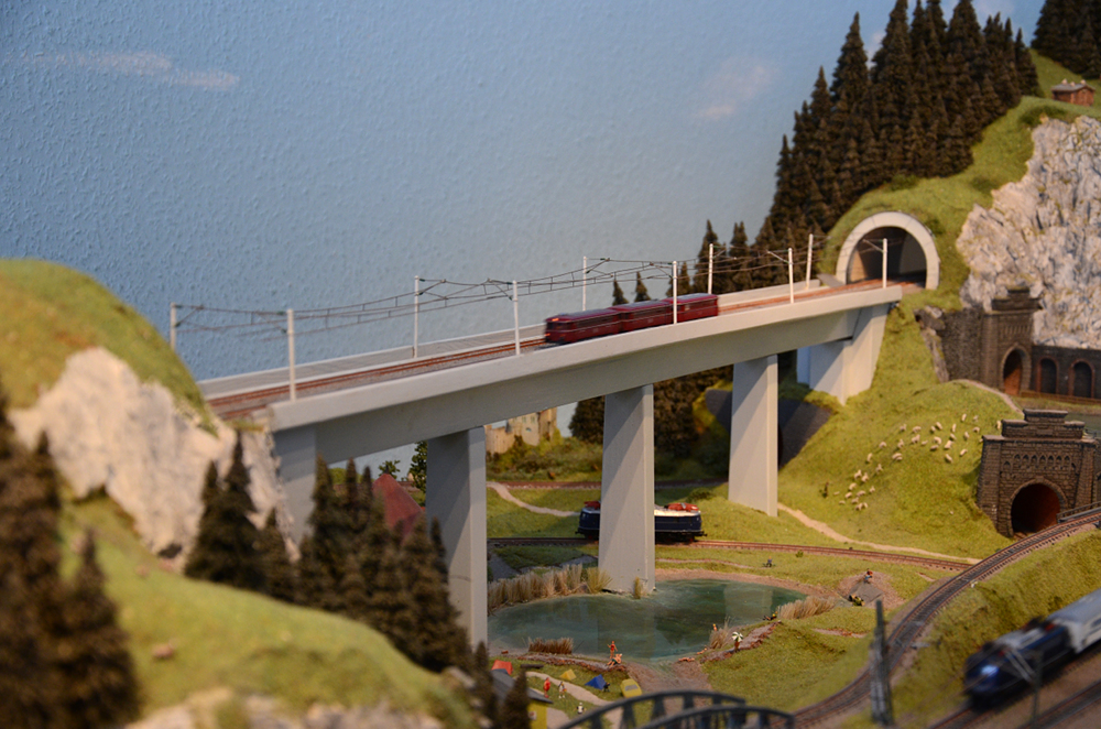 Im Blockbetrieb verkehren Personen- und Güterzüge digital gesteuert. Die Bahnstrecken im Schwarzwaldteil sind an die berühmten Vorbilder Höllental- und Dreiseenbahn angelehnt. Die Züge der SBB fahren im Schweizer Teil der Anlage über eine Nachbildung der Bietschtalbrücke. Im österreichischen Teil fährt eine kleine Schmalspurbahn (H0e) vorbei an den imposanten Bergrücken der Alpen. Die Anlage ist etwa 50 m² groß. Aufgenommen wurden die Bilder am 27. Dezember 2017.