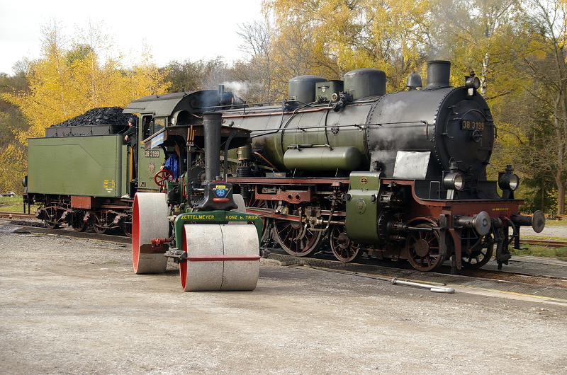 Auch die 38 3199 des Süddeutschen Eisenbahnmuseums Heilbronn war dabei. Vor ihr präsentiert sich eine Zettelmeyer-Dampfwalze.
