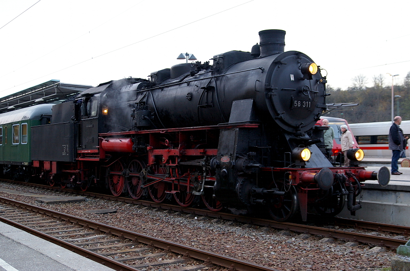 Die Ulmer Eisenbahnfreunde waren mit 58 311 vertreten. Am Bahnsteig wartet sie mit ihrem Sonderzug auf die Abfahrt.