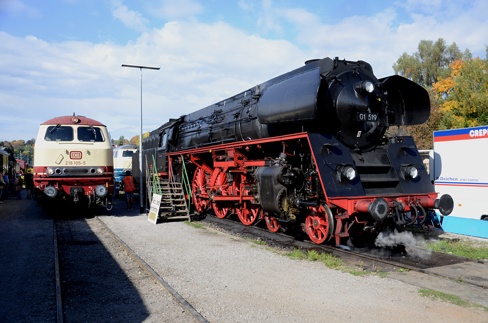 Mit 218 105 der NeSA wurden Führerstandsmitfahrten angeboten. Hier posiert sie neben 01 519 auf dem Gelände.