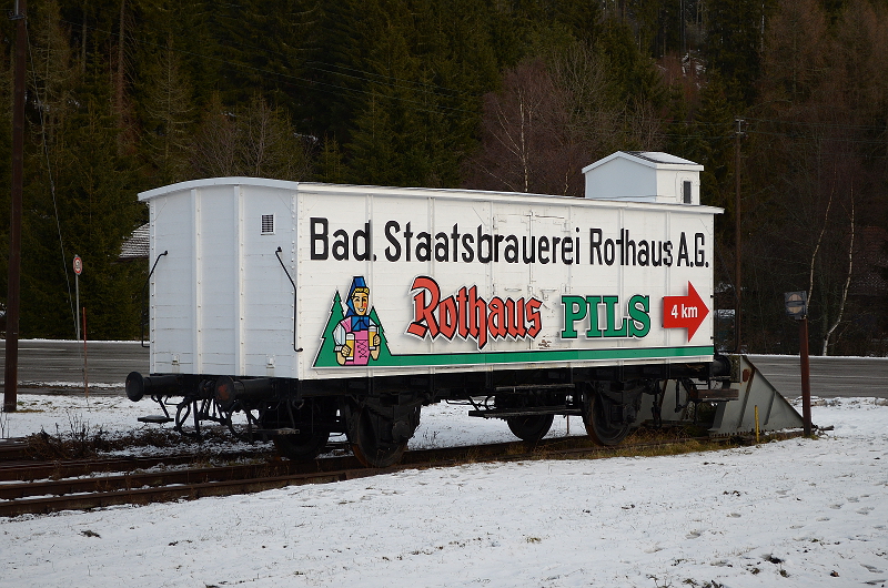 Der ehemalige Privat-Kühlwagen der Badischen Staatsbrauerei Rothaus (DR:545 407, DB:546 062) weist seit 1971 den auf der B 500 vorbeifahrenden den "rechten Weg".
