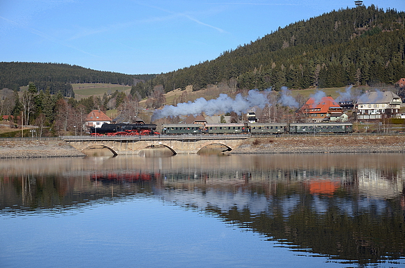 Bei der dritten Runde bin ich dann auch im Zug gesessen. Dieses Bild zeigt den Zug bei der Fahrt über den Schluchsee-Viadukt.