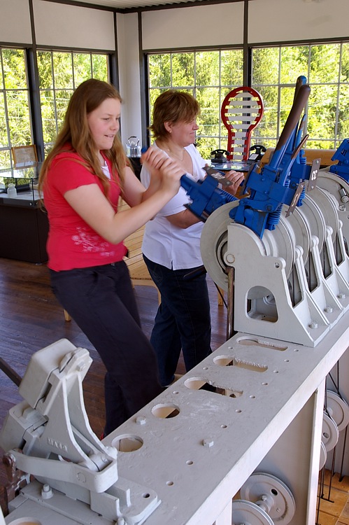 Oben im Stellwerk darf man ausprobieren was für eine Knochenarbeit das "Weichenstellen" einmal war.