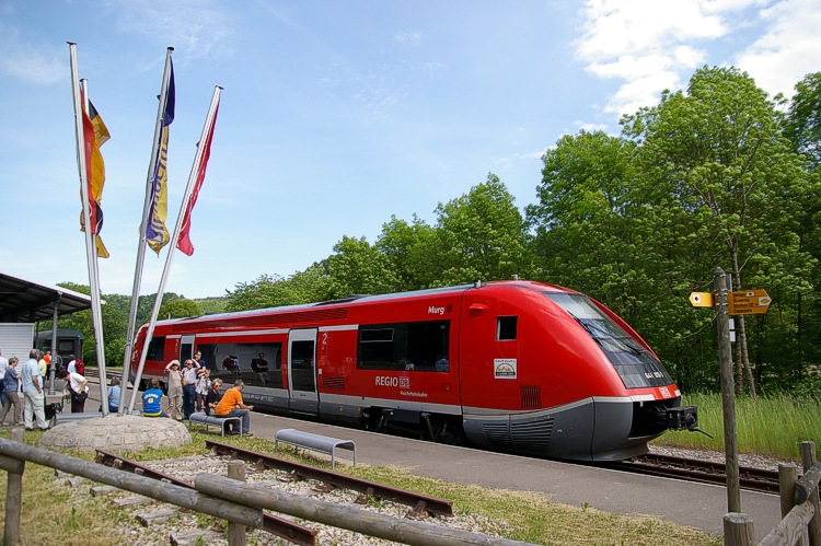 Die weitere Standortsuche endete im Haltepunkt Lausheim-Blumegg. Inzwischen hat sich der Morgendunst verzogen, und die Sonne beschien den einfahrenden Zug.