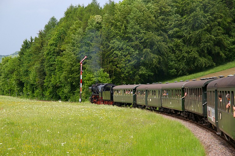 Gemütlich rollt die P8 mit ihrem Zug bei Achdorf talwärts.
