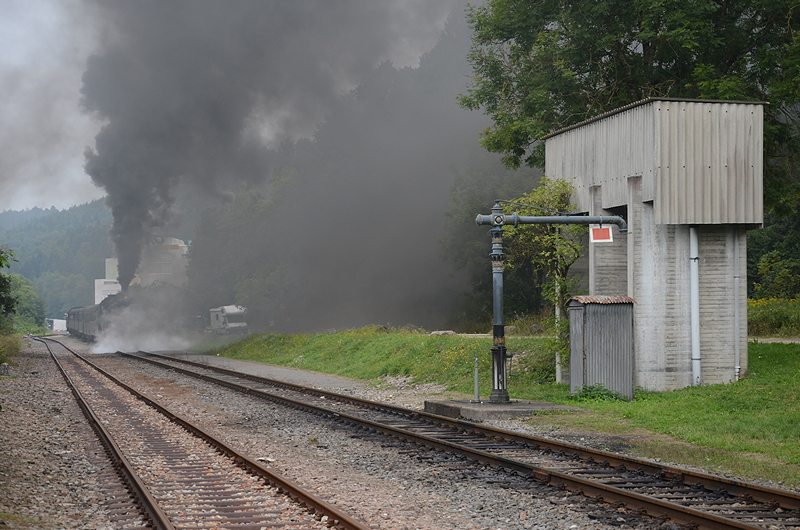 Nachdem das erledigt war, fuhr die Lok vor den Zug und machte sich bereit für die Abfahrt. Diese erfolgte dann unter beachtlicher Rauchentwicklung.