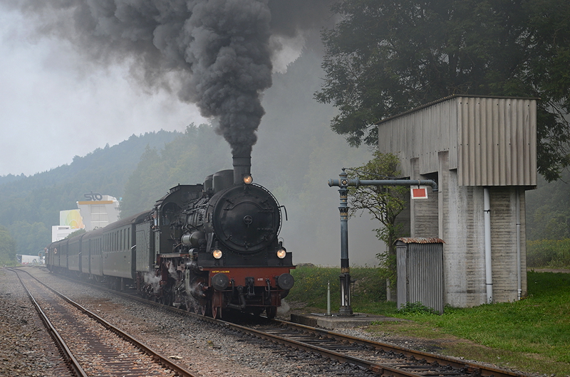 Für die zweite Talfahrt des Tages begaben wir uns wieder an den Bahnhof Epfenhofen. Es regnete immer noch als der Zug kurz davor den Viadukt überquerte.