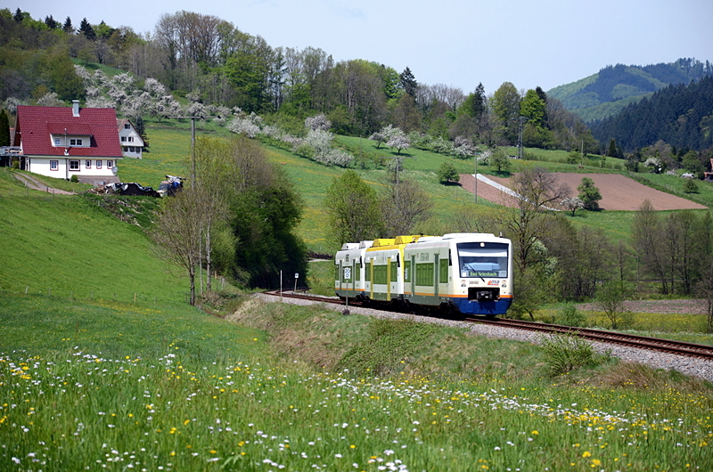 SWE 87386 nach Bad Peterstal-Griesbach war dreiteilig unterwegs mit VT 532 "Lossburger Ferienland", VT 525 "BaWü-Design, ex-Willstätt" und VT 515 "Stadt Haslach". Aufgenommen wurde das Gespann bei Ibach.