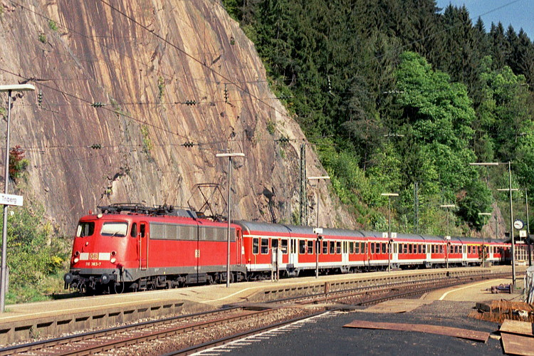Vor dem markanten Felsen am Triberger Bahnhof possiert 110 383 mit dem RE 18003 (Karlsruhe-Konstanz).