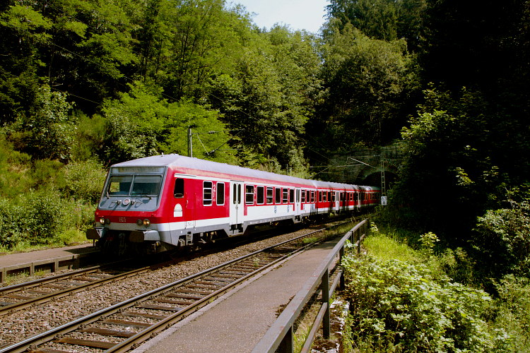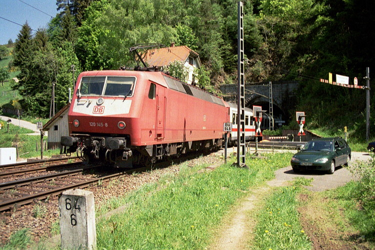 Mit dem IC 2275 taucht 120 145 in das Dunkel des 313 m langen Farrenhalde-Tunnels ein.