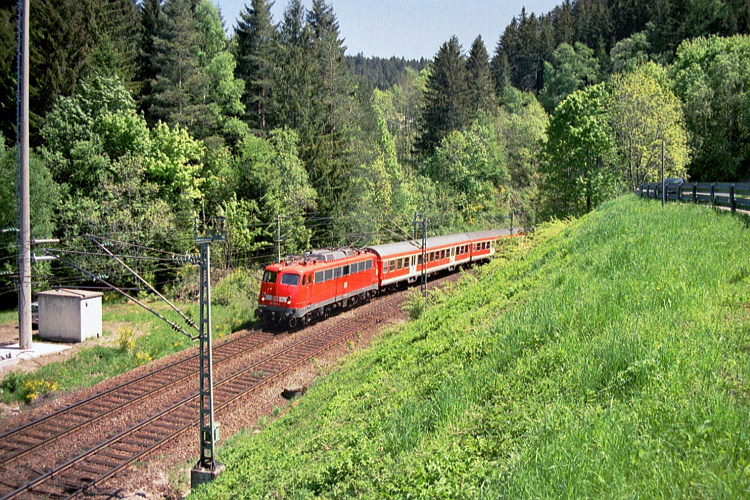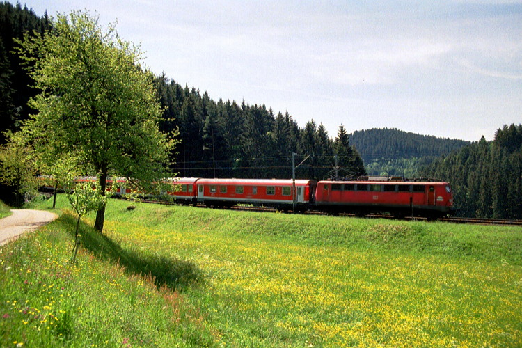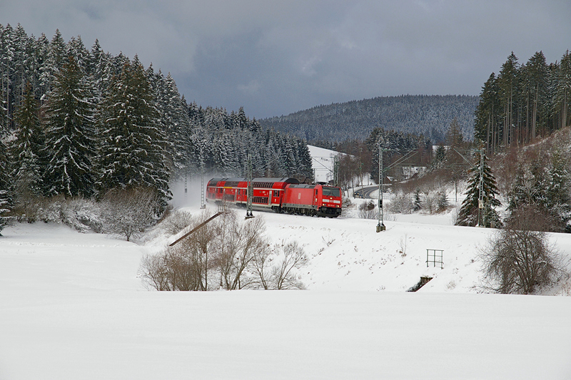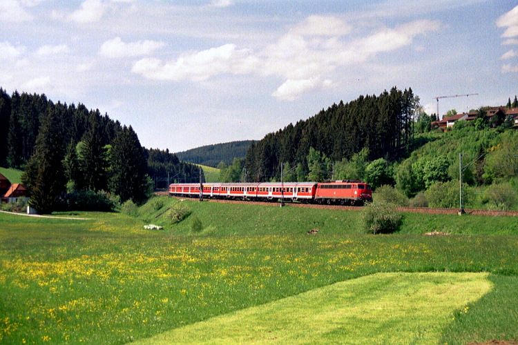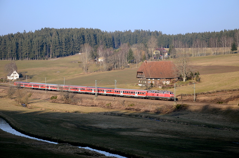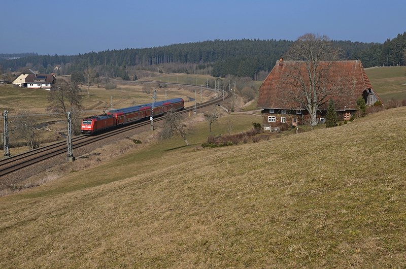 Hier bei St. Georgen ist der höchste Punkt der Schwarzwaldbahn (832 Meter über dem Meeresspiegel bei Sommerau) bereits überschritten. Eine unerkannt gebliebene 110er ist mit dem IRE 1813 nach Konstanz unterwegs.