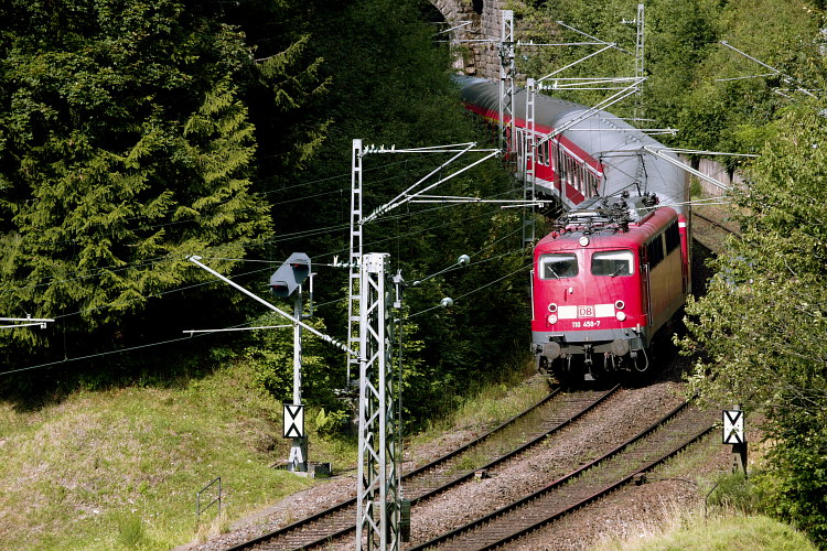 Bei Steinbis ist 110 458 mit dem IRE 4105 (Karlsruhe - Konstanz) unterwegs.