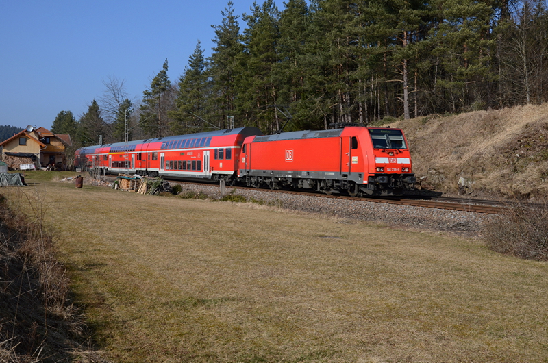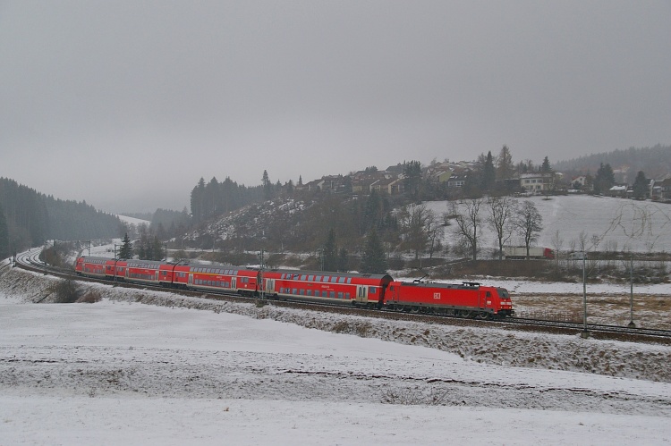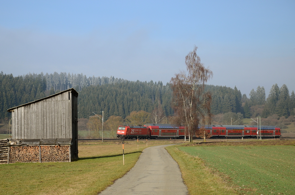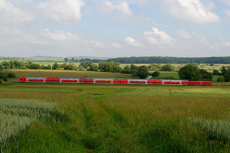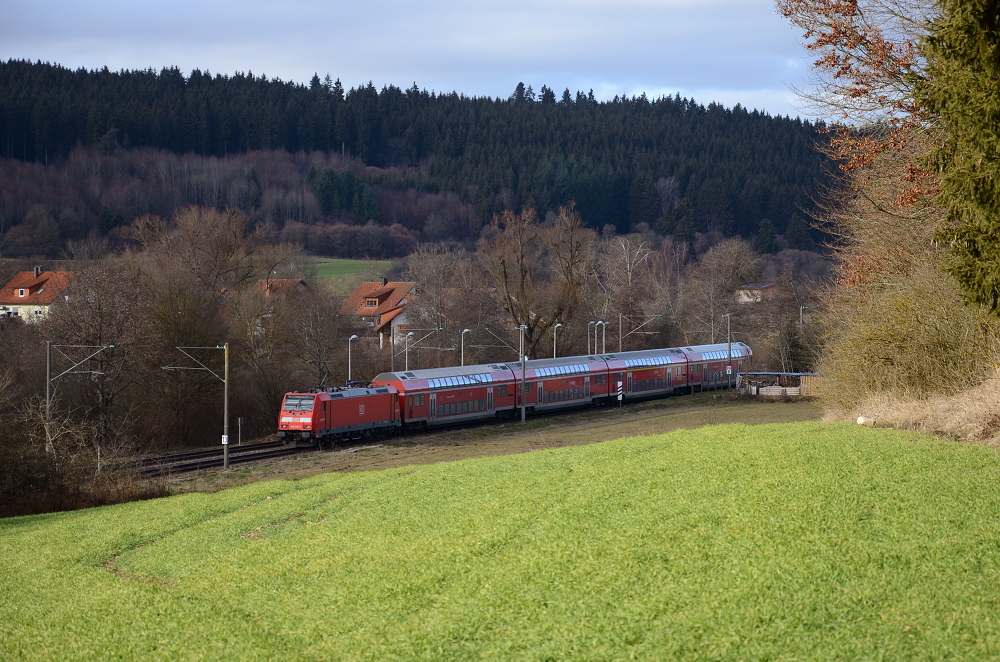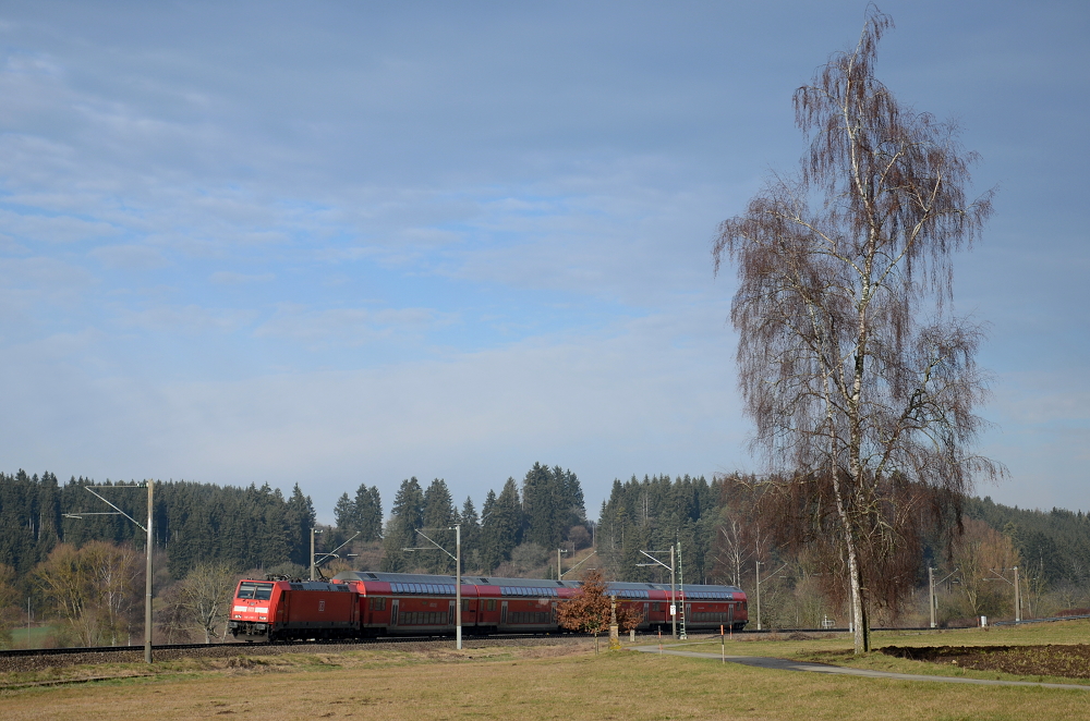 Zwischen Neudingen und Gutmadingen ist dieses Bild entstanden. Der RE 5187 fährt nach Konstanz. Gezogen wird er von einer Lokomotive der Baureihe 146.