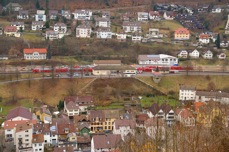 Ein Blick vom Schlossberg hinunter zum Hornberger Bahnhof. Hier kreuzen sich gerade der RE 5191 nach Konstanz und der RE 4708 nach Offenburg.