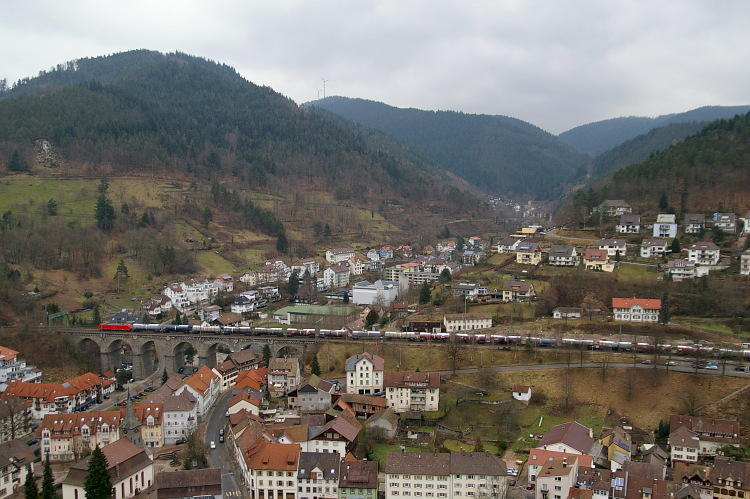 Vom Schlossberg aus hat man einen wunderbaren Blick auf Hornberg und sein Viadukt. Eine 110er zieht ihren IRE bergwärts in Richtung Konstanz.