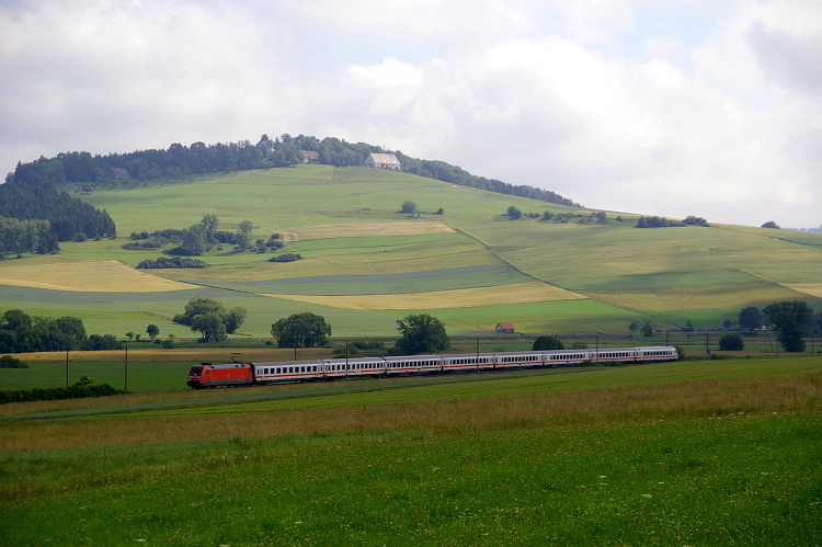 Kurz darauf folgt in der Gegenrichtung der IC 2370. Gezogen von einer 101 wird er noch eine ganze Weile bis Hamburg unterwegs sein. Im Hintergrund ist der 810 Meter hohe Wartenberg zu sehen.