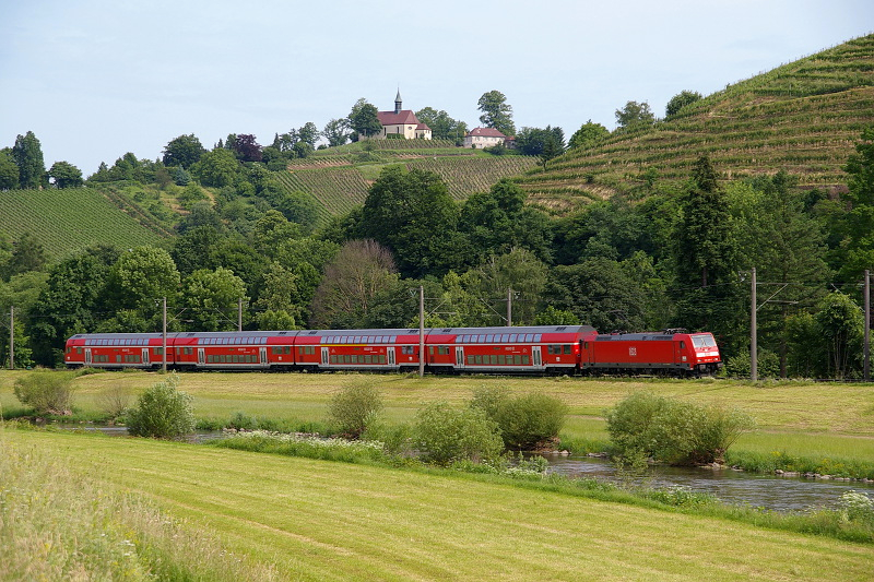 Als Kulisse für dieses Foto diente die Jakobskapelle auf dem Kastellberg bei Gengenbach. 146 238 zieht den IRE 5185 von Karlsruhe über die Schwarzwaldbahn nach Konstanz.