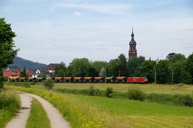 152 039 befördert den Kieszug CS 61819 von Friesenheim nach Villingen. Im Hintergrund ist der Turm der Stadtkirche St. Marien von Gengenbach zu sehen.