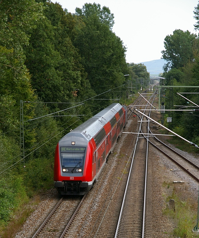 An der selben Stelle, nur auf der anderen Seite der Gleise, entstand dieses Foto vom RE 18007 (Karlsruhe-Konstanz). Schublok ist 110 471.