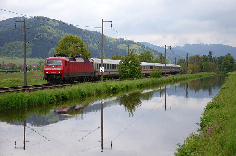 120 123 ist mit dem IC 2270 (Konstanz-Stralsund) unterwegs am Haslacher Kanal.