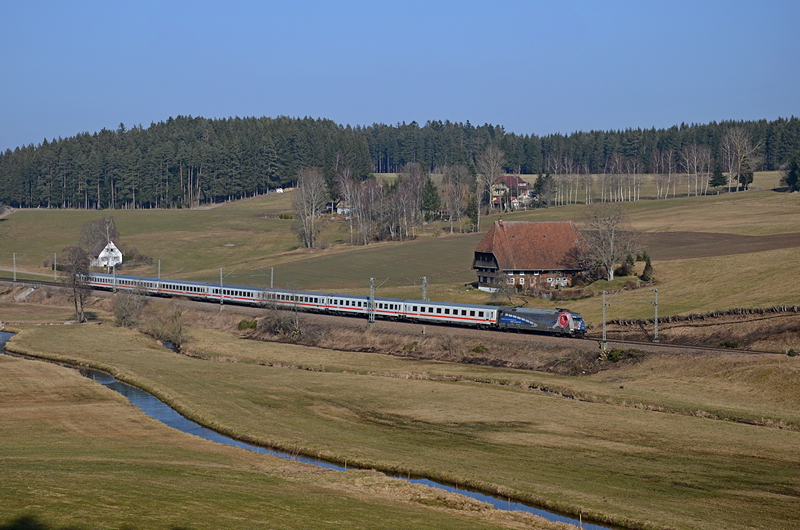 IC 2005 "Bodensee" (Emden-Konstanz) mit 101 060 "60 Jahre Bundespolizei" fährt am Fotografen vorbei. Im Vordergrund ist die Brigach zu sehen. Dieses Bächle gibt - zusammen mit der Breg - einmal die Donau.