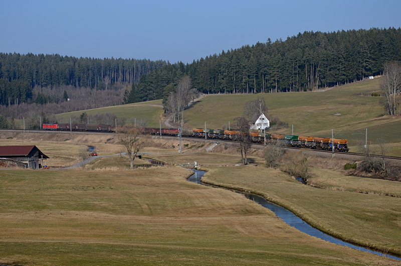 Meistens Dienstags, Mittwochs und Freitags verkehrt der leere "Ölbomber" GC 61760 von Schwenningen nach Karlsruhe-Knielingen. Kurz nach 12 Uhr kommt er am Kanal von Haslach vorbei. Zuglok war heute 185 372.