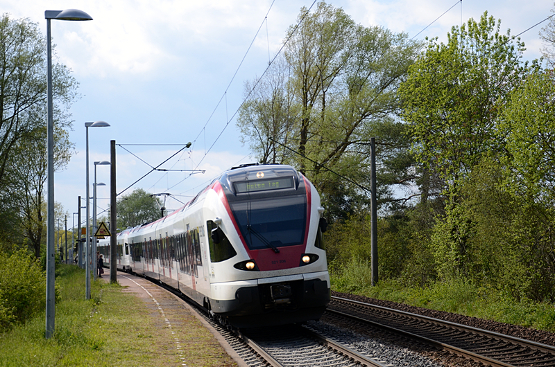 Der RE 4716 von Konstanz nach Karlsruhe hat gerade den ehemaligen Bahnhof von Grüningen passiert. Dieser ist im Hintergrund noch zu erkennen.