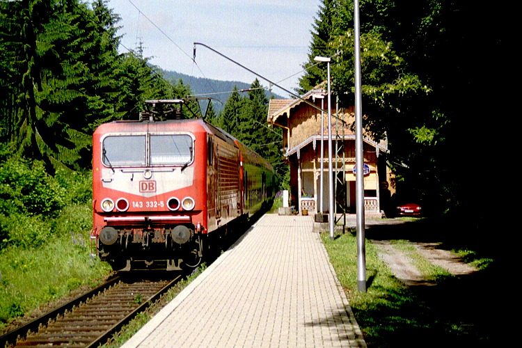 Längst halten am Bahnhof Höllsteig keine Züge mehr. Auch die von 143 332 gezogene RB 18577 fährt ohne anzuhalten weiter in Richtung Titisee.