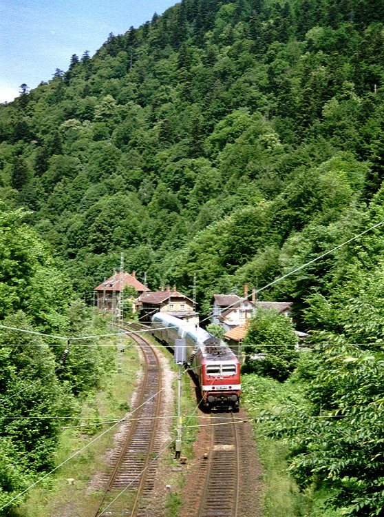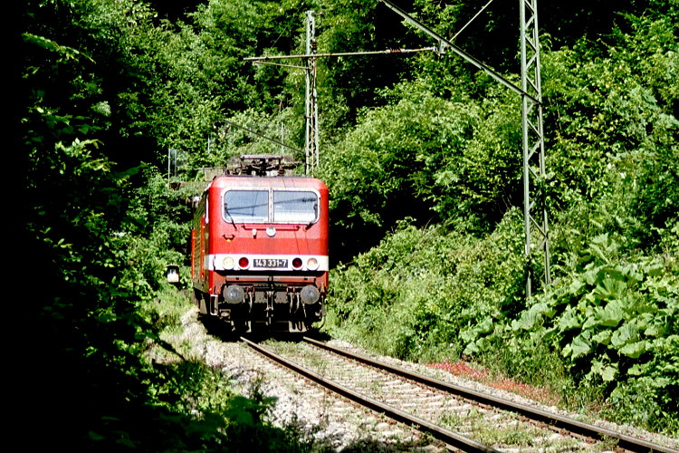 Vom ehemaligen Bahnhof Posthalde ist nicht mehr viel zu sehen. 143 315 zieht eine Regionalbahn bergwärts.