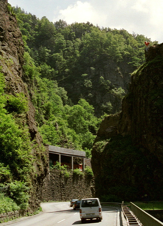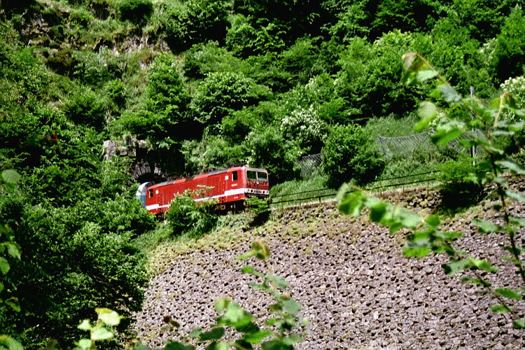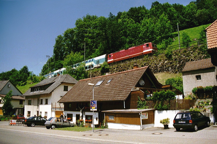 Diese Regionalbahn hat eben den Kehre-Tunnel talwärts verlassen, und wird gleich den Bahnhof Hirschsprung erreichen.