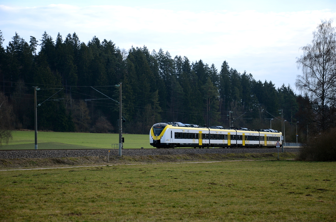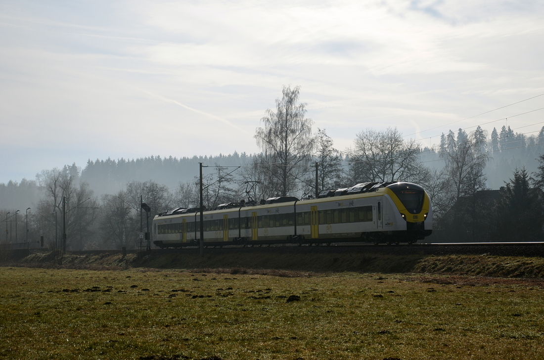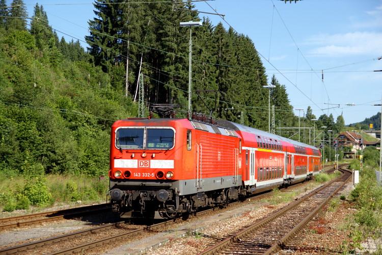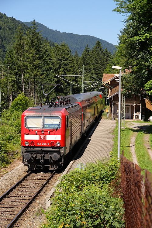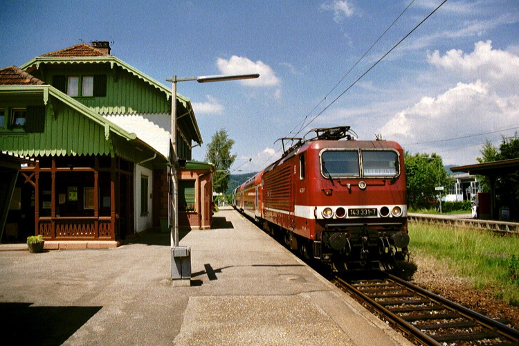 Am Bahnhof Höllsteig sieht es aus, als ob hier wieder Züge halten würden, dem ist jedoch nicht so. Ein Nachschuss auf 143 364 welche die RB 31580 an dem gepflegten Bahnsteig vorbei schiebt.