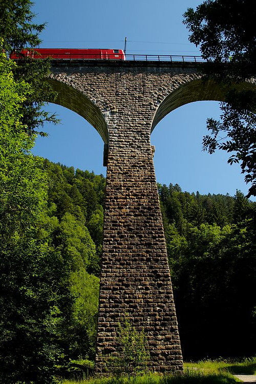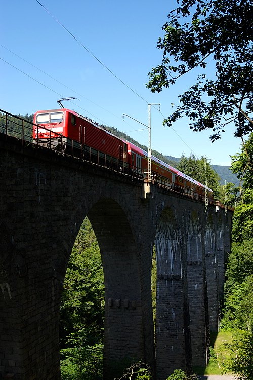 56 Meter lang ist die Brücke über den Engenbachtobel. Eine 143er ist mit der RB 18590 auf der Fahrt nach Freiburg.