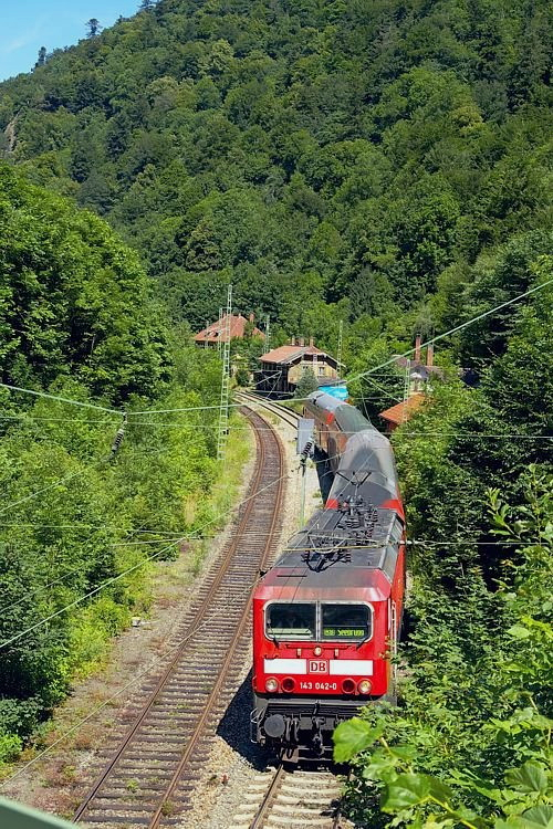 Die andere Seite liegt schon im Schatten. 143 042 bremst die RB 31574 talwärts.