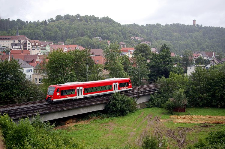 Vor der nördlichen Bahnhofseinfahrt von Horb wird der Neckar überquert. Aus Pforzheim fährt 650 303 als RB 22251 nach Horb ein. Dieser Triebwagen trägt Namen und Wappen der Stadt Calw.
