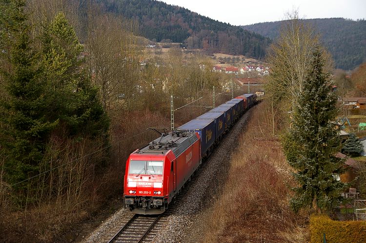 Güterverkehr im Neckartal: Um 12:19 Uhr zieht die 185 253 bei Dettingen einen Güterzug nach Singen.