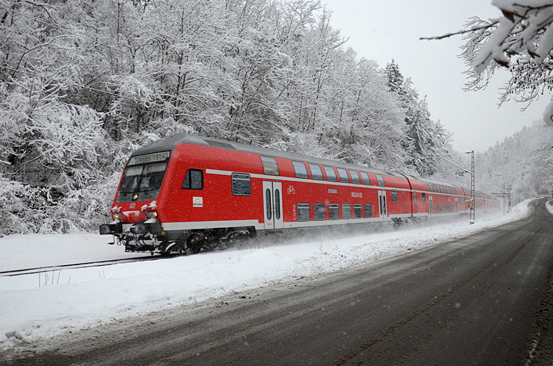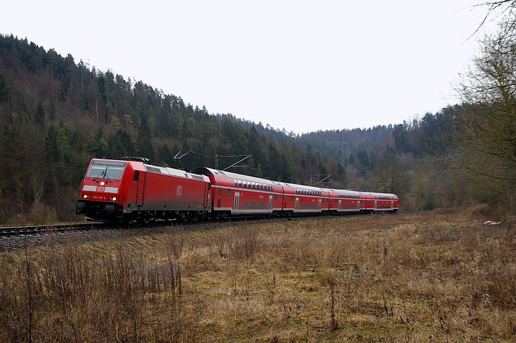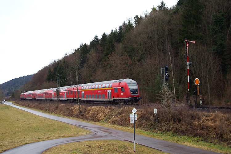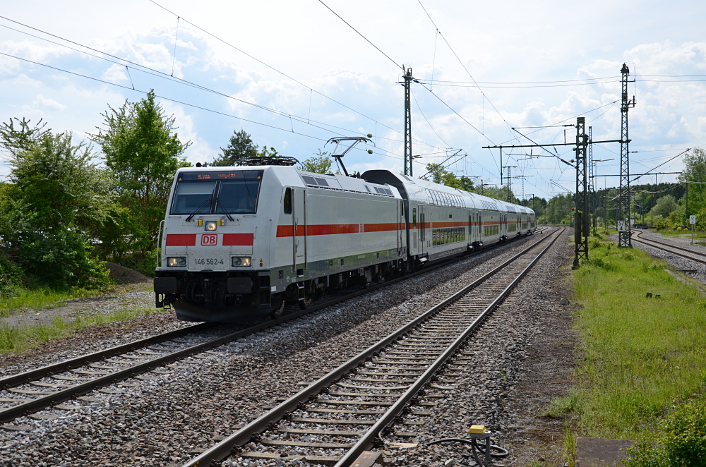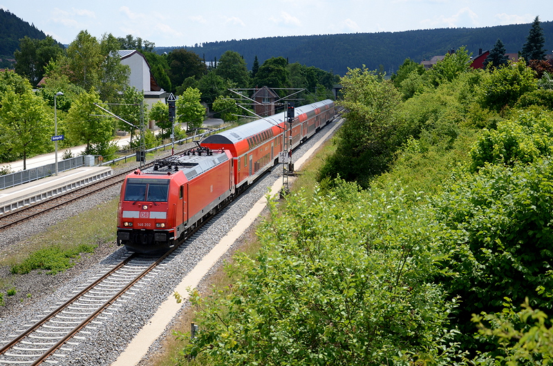 Nochmal dasselbe Motiv mit dem RE 19655 (Stuttgart-Singen). Der Steuerwagen voraus fahrende Zug wird von einer 146er geschoben.