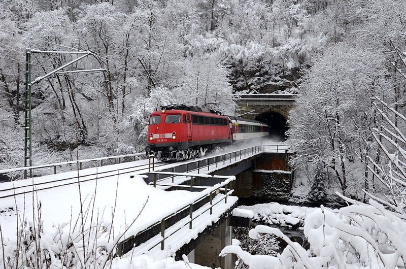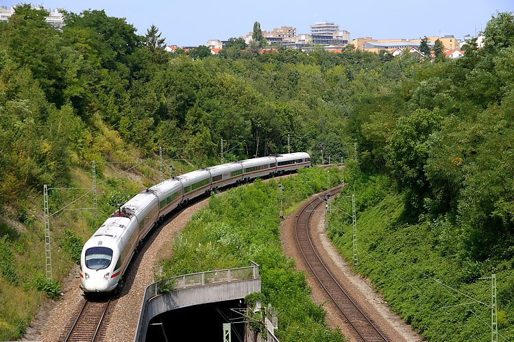 Der Blick in die andere Richtung zeigt das Nordportal des 269 Meter langen Bernburg-Tunnels. Aus ihm taucht gerade 115 383 mit dem IC 282 nach Stuttgart auf.