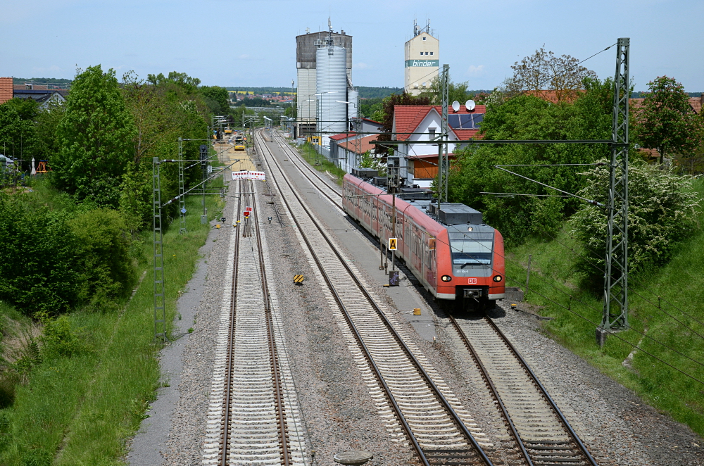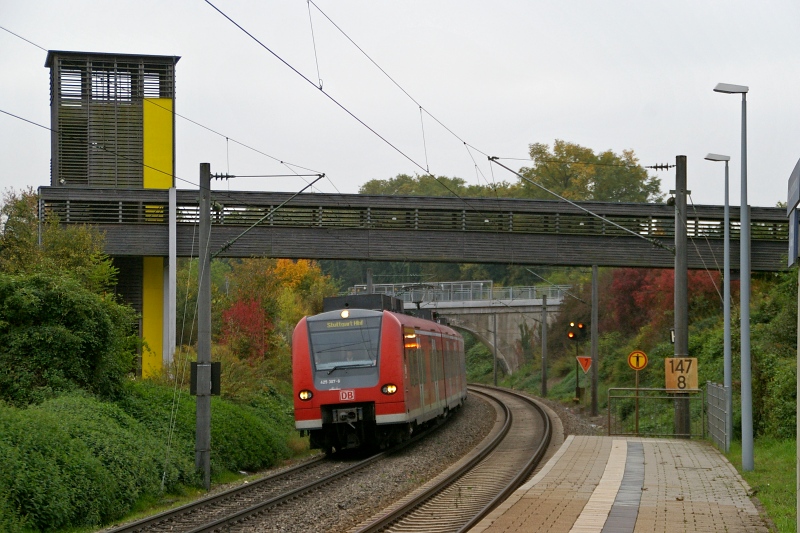 411 081 ist bei der S-Bahn-Haltestelle Stuttgart-Österfeld unterwegs nach Singen. Er hat die Steigung im Stadtgebiet erklommen und wird gleich den Bahnhof Stuttgart-Vaihingen erreichen.