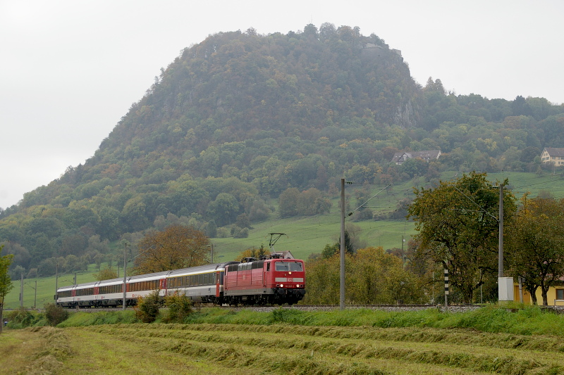 Nach knapp zwei Stunden kommt die Maschine in Gegenrichtung wieder am Hohentwiel vorbei. Nun hat sie den IC 280 (Zürich-Singen-Stuttgart) am Haken.