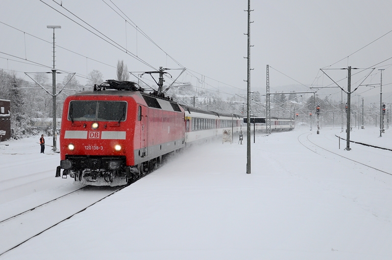 Mit etwa ¼ Stunde Verspätung fährt 120 138 mit dem IC 284 (Zürich-Stuttgart) in den Rottweiler Bahnhof ein.