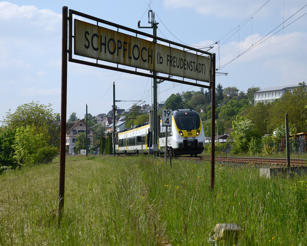 In Schopfloch stehen noch die alten Bahnhofsschilder. Hier habe ich versucht den 422 200 (RE 17610, Freudenstadt-Stuttgart) damit einzurahmen.