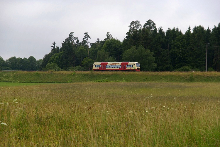 VT 240 hat als HzL 69735 (Bräunlingen-Immendingen) einen kurzen Halt in Aufen eingelegt und verläßt nun das Dörfchen in Richtung Villingen.