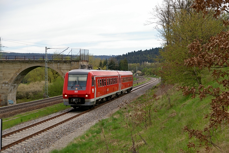 eim Haltepunkt Rottweil-Saline ist 611 050 als RE 22309 unterwegs von Neustadt nach Rottweil. Im Hintergrund die Reste der Primtalbrücke der ehemaligen Bahnstrecke Balingen-Schömberg-Rottweil.
