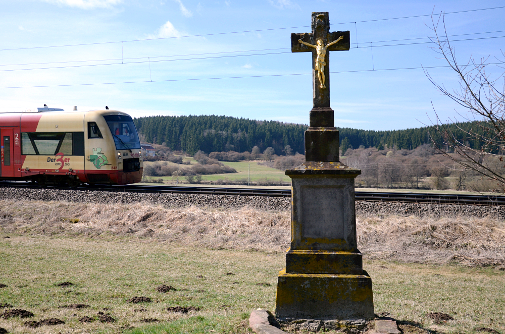 Zwischen Klengen und Grüningen findet man noch schöne, alte Kilometersteine zum experimentieren. VT 239 und 243 fahren als HzL 88062 gen Donaueschingen.