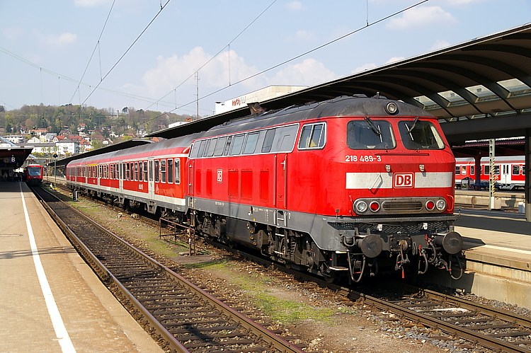 218 489 wartet in Ulm auf die Abfahrt nach Friedrichshafen.