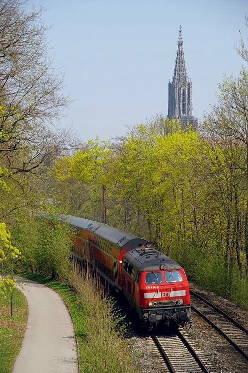 Nach etwas mehr als einem Kilometer nach den Ulmer Hbf hat man von einer Straßenbrücke diesen Blick auf die Strecke mit dem Münster im Hintergrund. 218 438 ist mit dem IRE 4209 unterwegs nach Friedrichshafen.