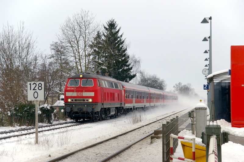 Zwischen Oberzell und Meckenbeuren fand sich beim "Lohner Hof" noch dieses Motiv. 218 439 zieht den IRE 4231 nach Friedrichshafen.