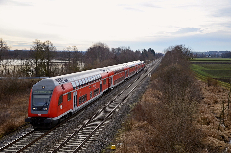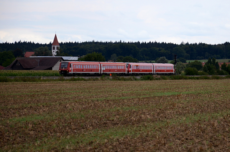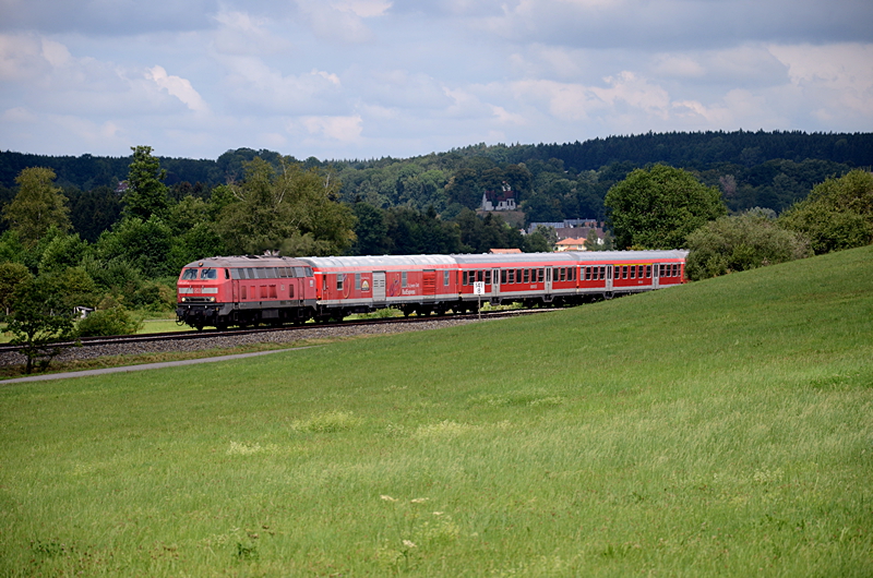 Der IRE 4229 hat auf seiner Fahrt nach Lindau eben das Dörfchen Mochenwangen passiert, und wird in Kürze Ravensburg erreichen. Zuglok ist 218 438.
