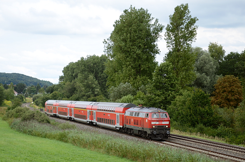 218 406 zieht den IRE 4227 (Stuttgart-Ulm-Friedrichshafen-Lindau) Richtung Süden. Das Bild entstand kurz nach der Abfahrt in Aulendorf.