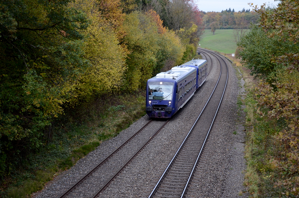 Auf diesem Bild fahren VT 68 und 63 der Bodensee-Oberschwaben-Bahn beim "Lohner" als BOB 87581 von Aulendorf nach Friedrichshafen-Hafen.